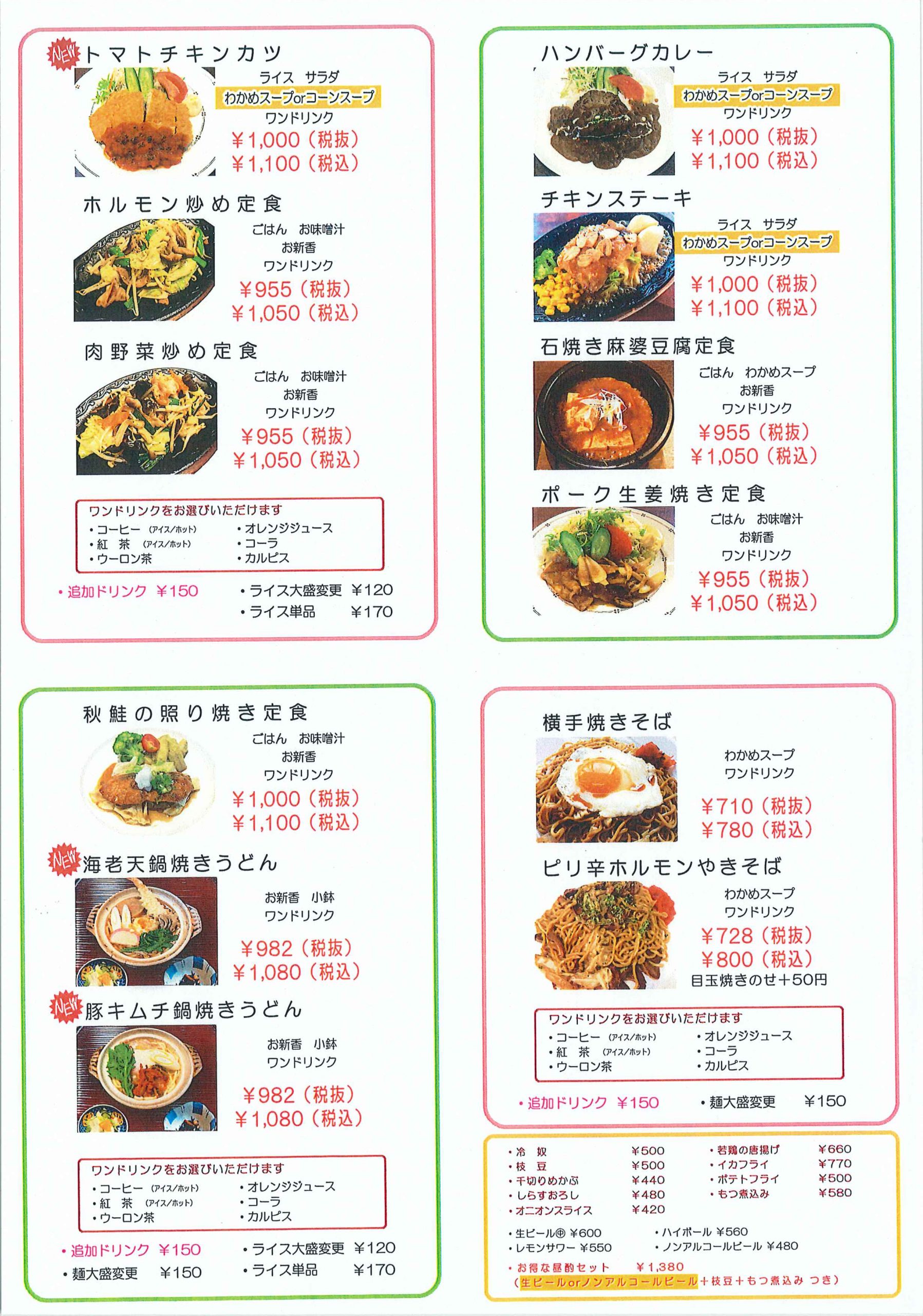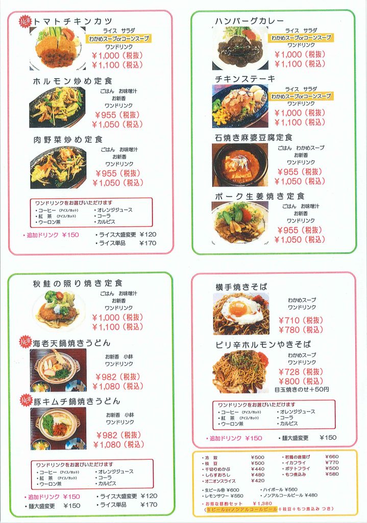 今月のオススメは、チキントマトスープパスタ、サーモンクリームパスタ、トマトチキンカツ、海老天鍋焼きうどん、豚キムチ鍋焼きうどんの5品です。