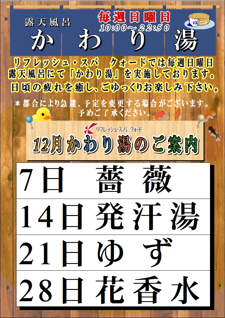 令和7年12月のかわり湯の日程が決まりましたので、ご案内させていただきます。