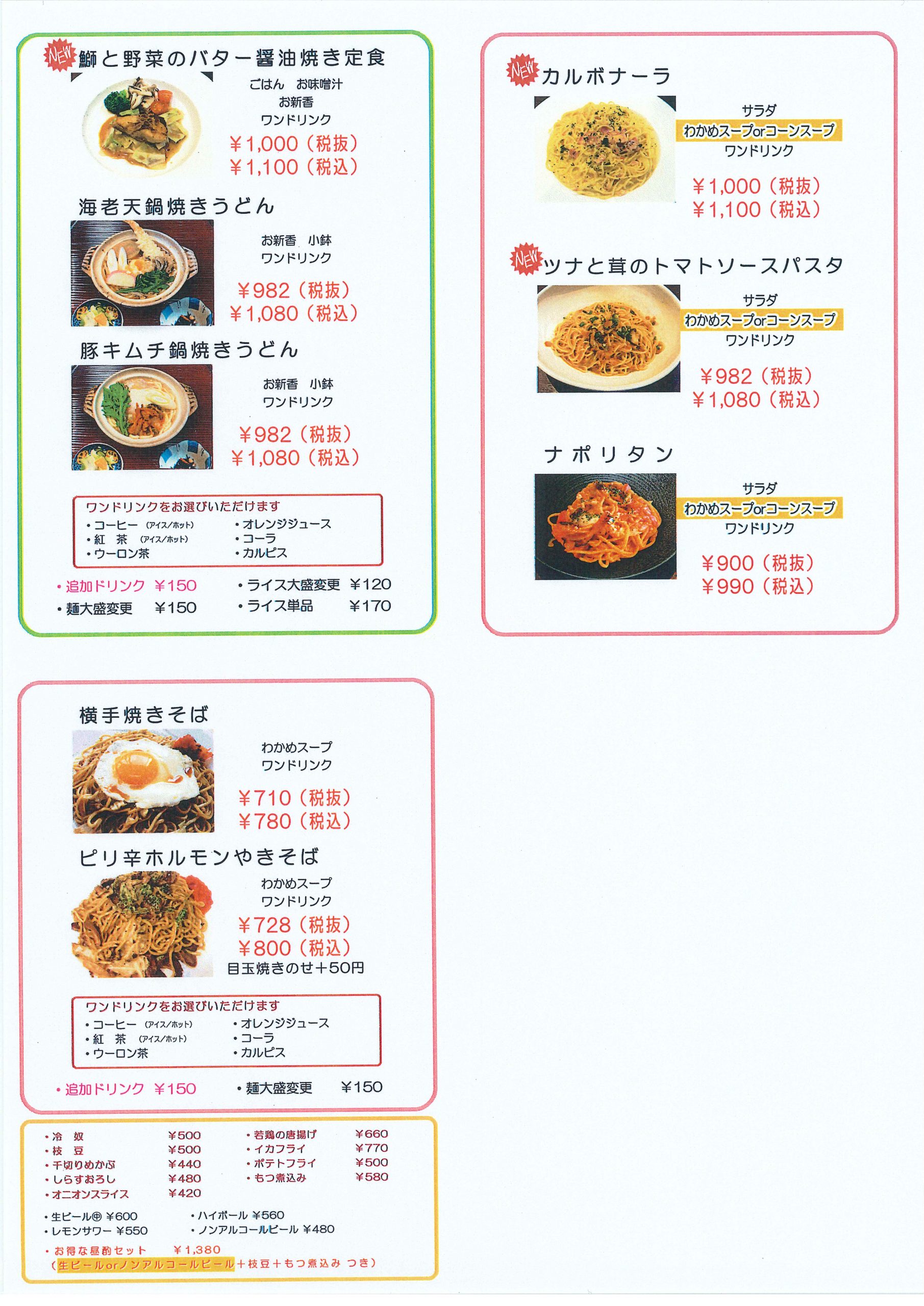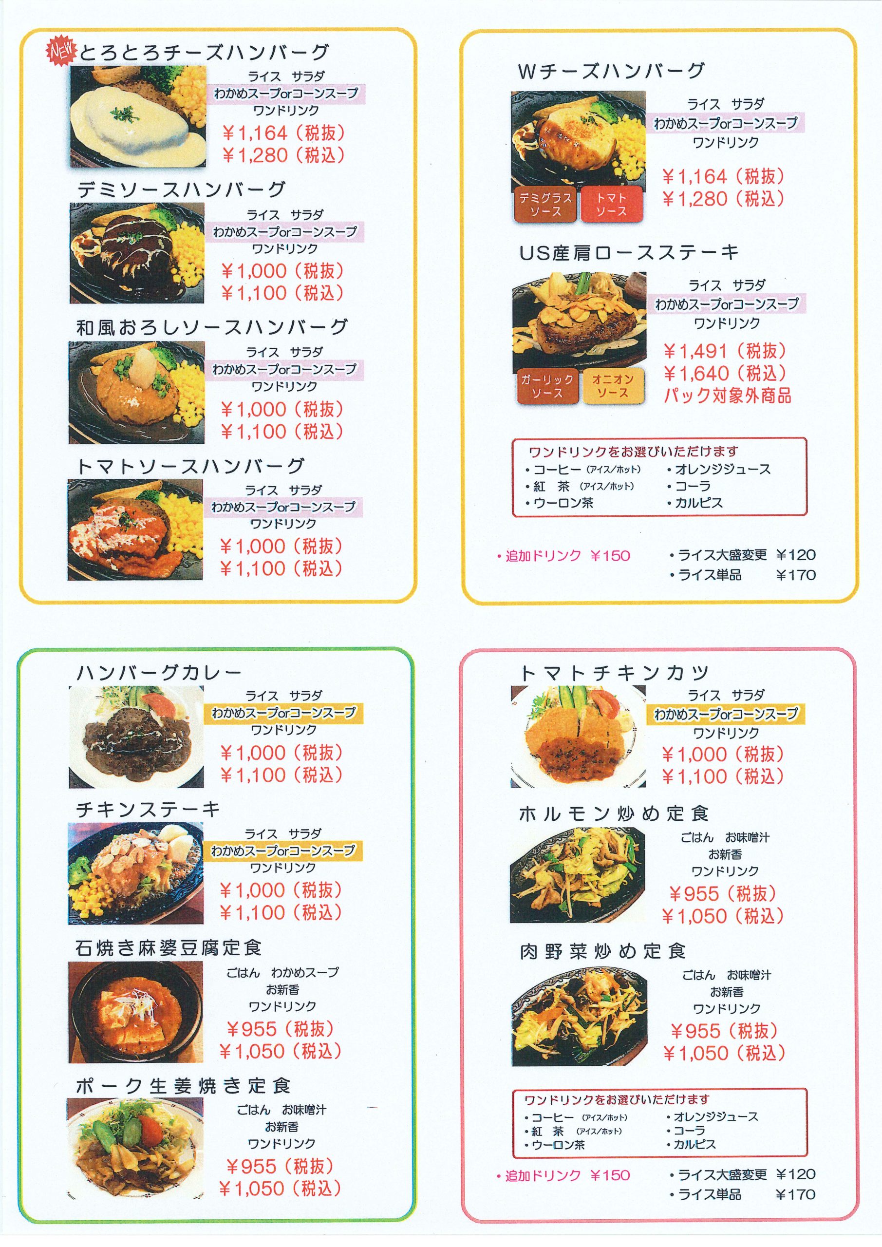 今月のオススメは、とろとろチーズハンバーグ、鰤と野菜のバター醤油焼き定食、カルボナーラ、ツナと茸のトマトソースパスタの4品です。